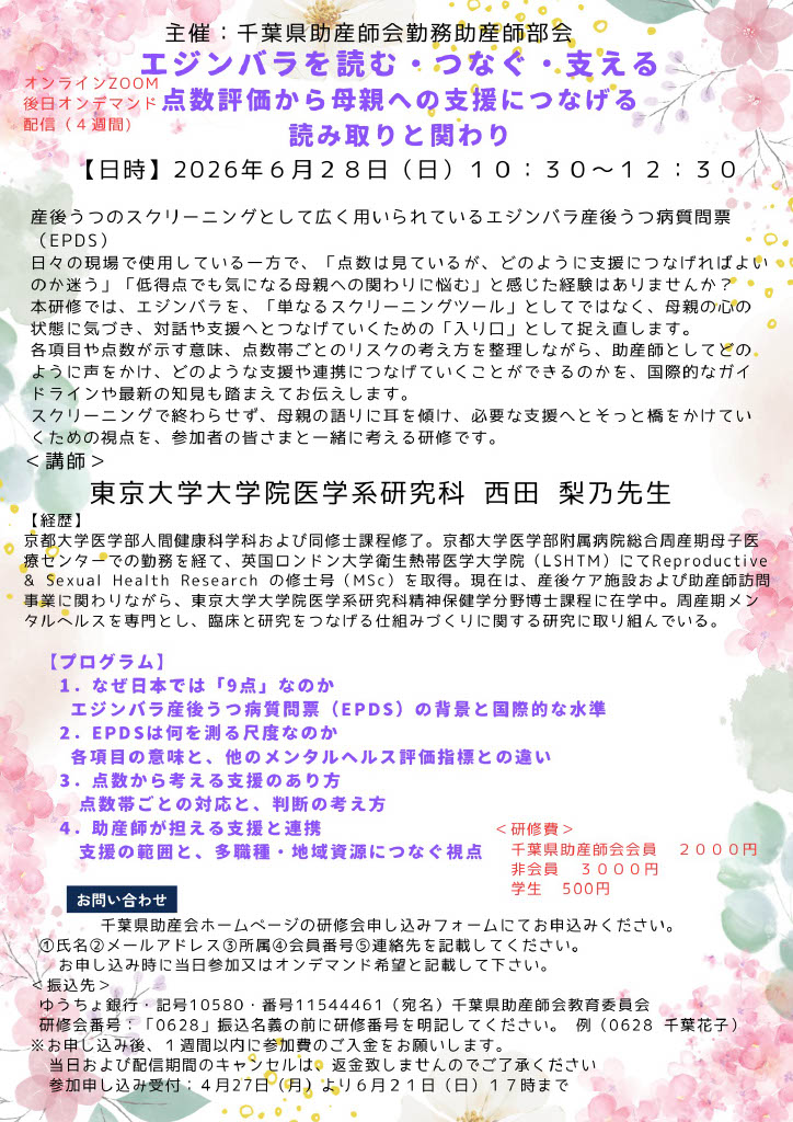 各項目や点数が示す意味、点数帯ごとのリスクの考え方を整理しながら、助産師としてどのように声をかけ、どのような支援や連携につなげていくことができるのかを、国際的ガイドラインや最新の知見も踏まえてお伝えします。